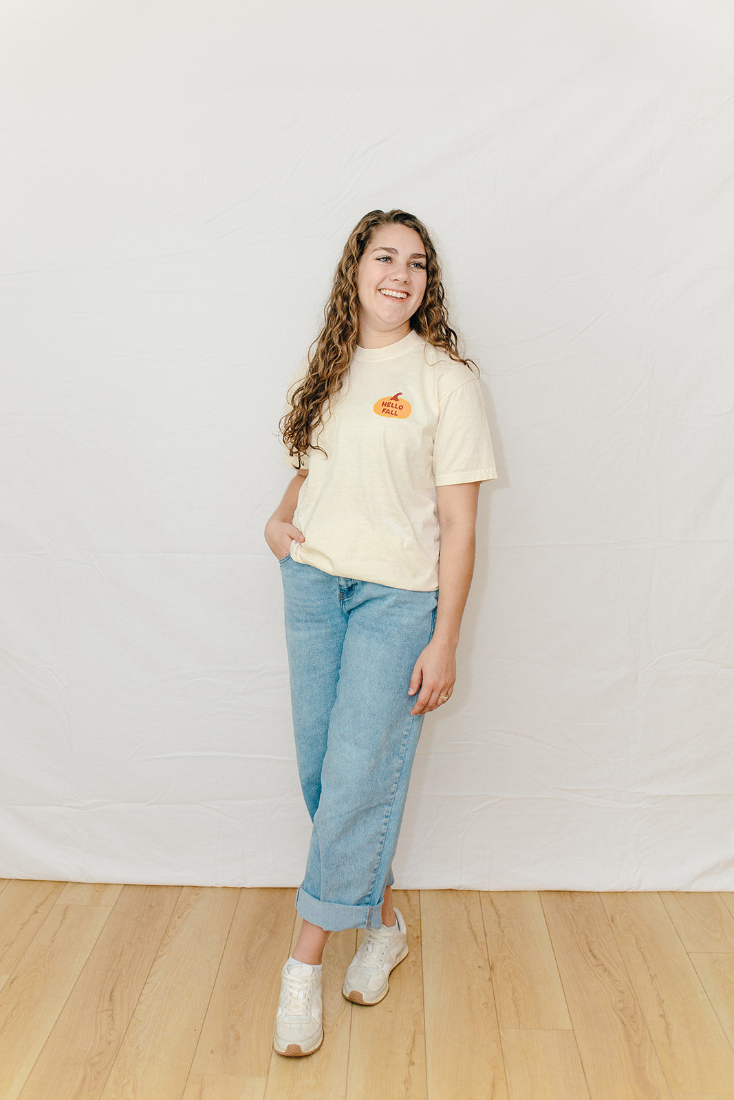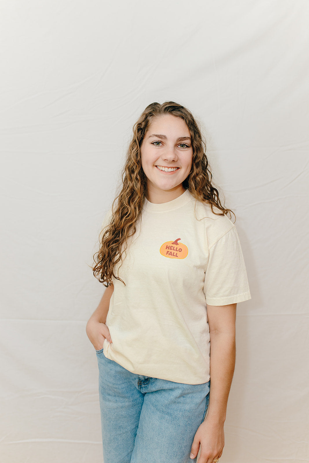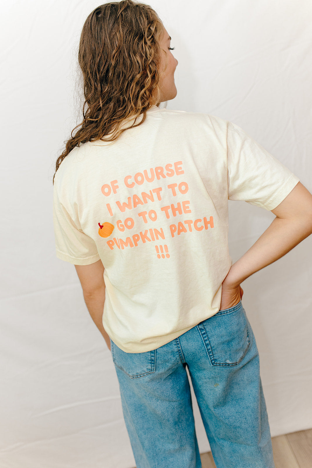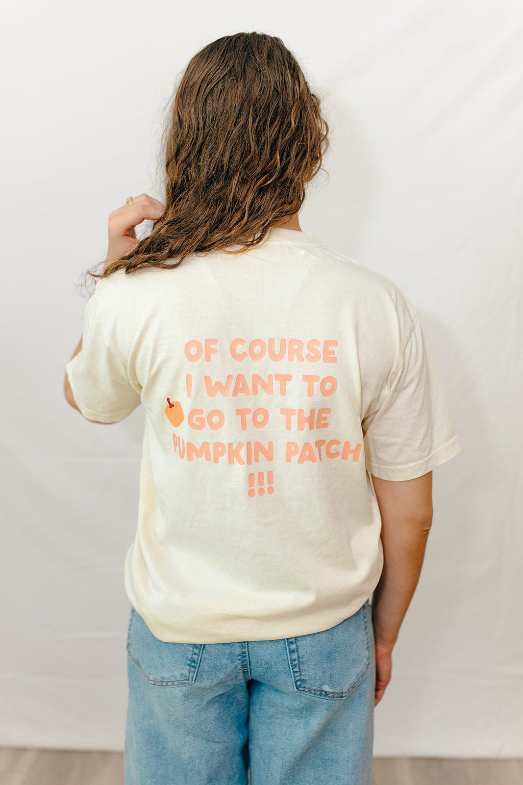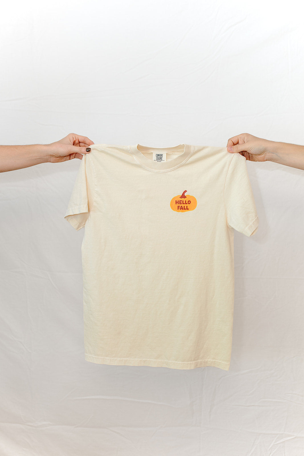 This Comfort Colors tee is a cream color with a pumpkin on the front with cutie words on the back. Perfect shirt for a girlie fall!