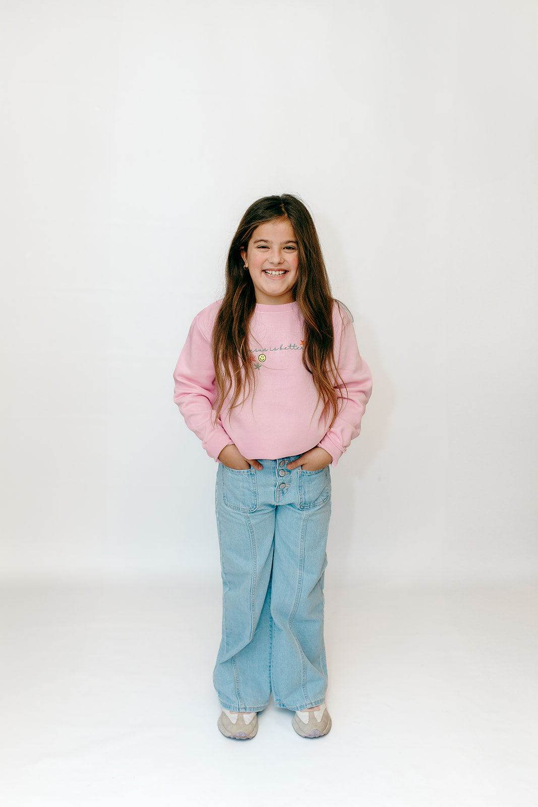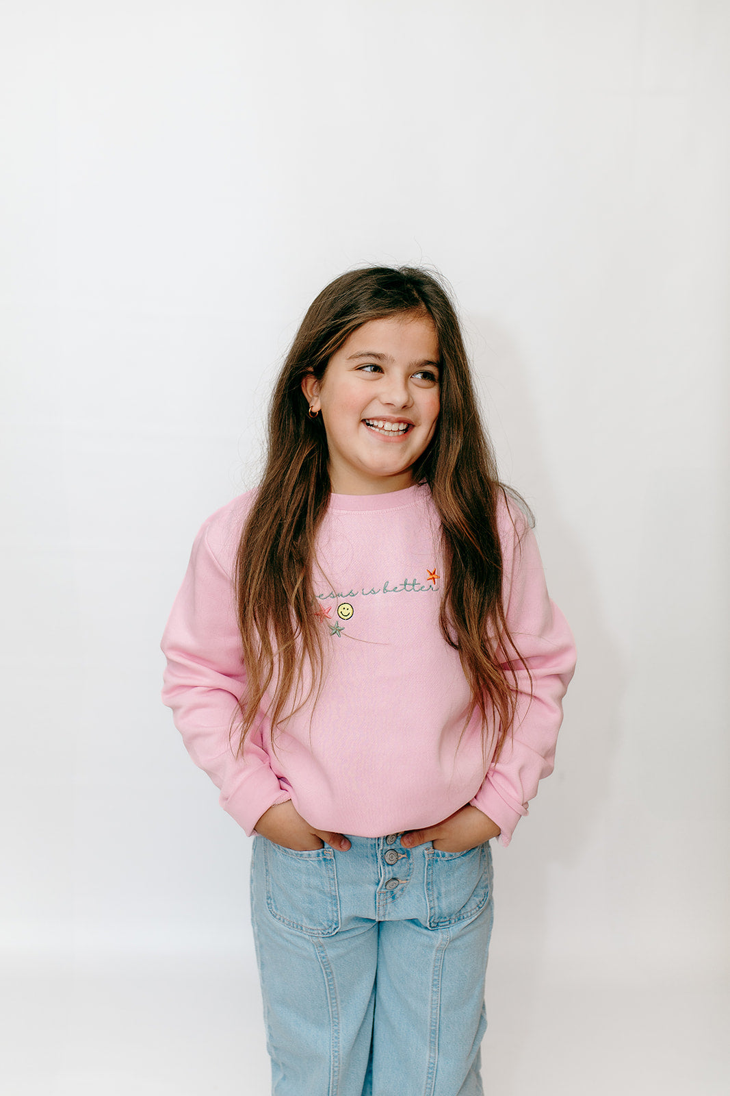 This pink sweatshirt is embroidered across the front and perfect for your tween girl.