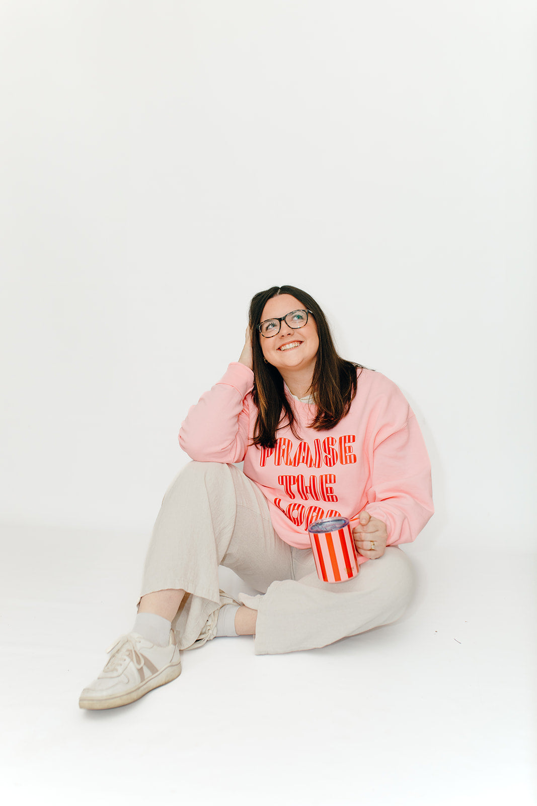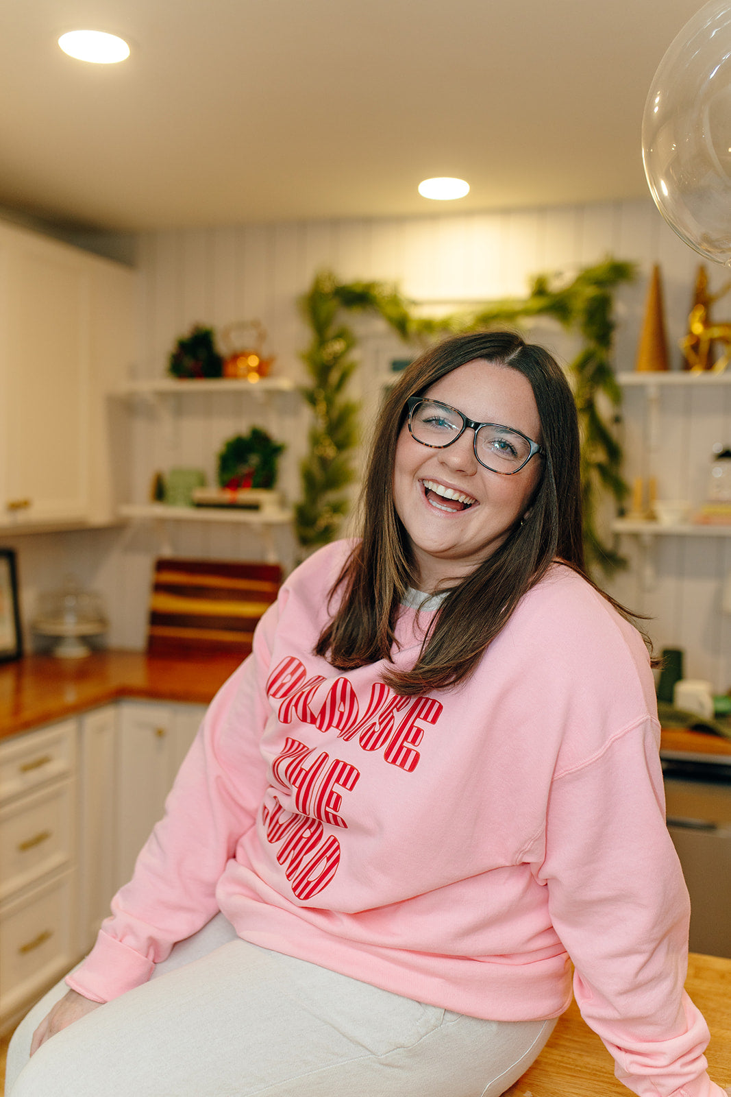 This pink sweatshirt with peppermint striped letters is perfect for Christmas, but can also carry into Valentine's Day! Pair it with our Peppermint Stripe travel mug!