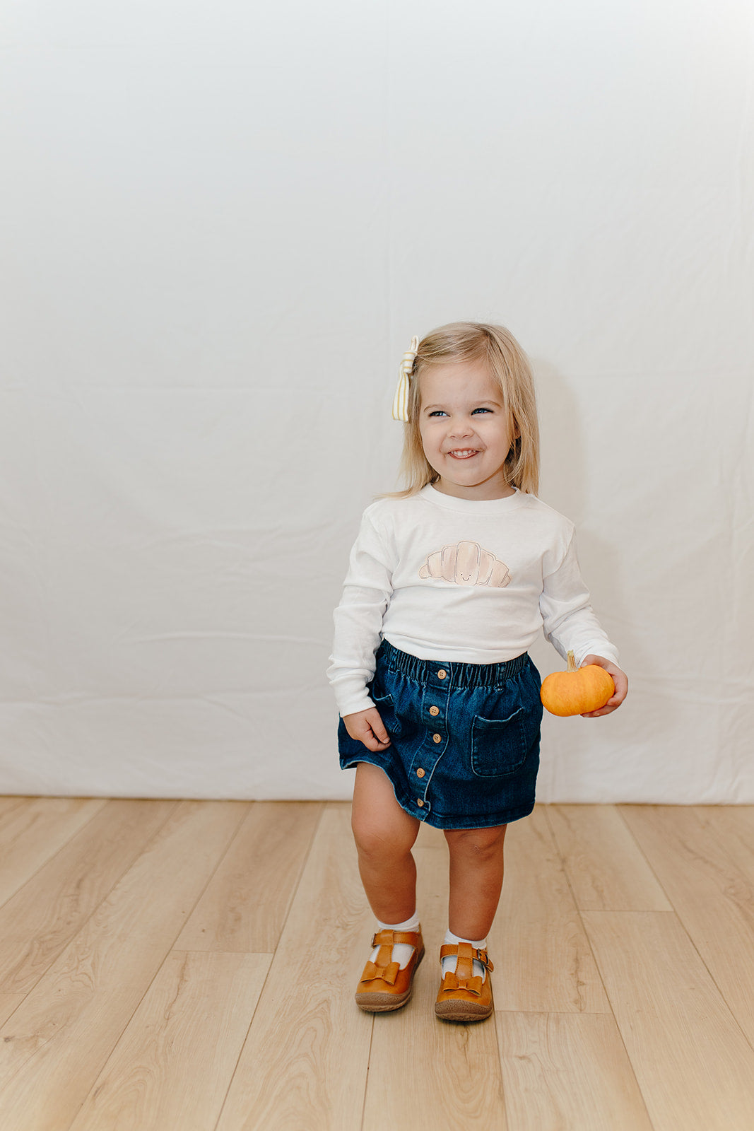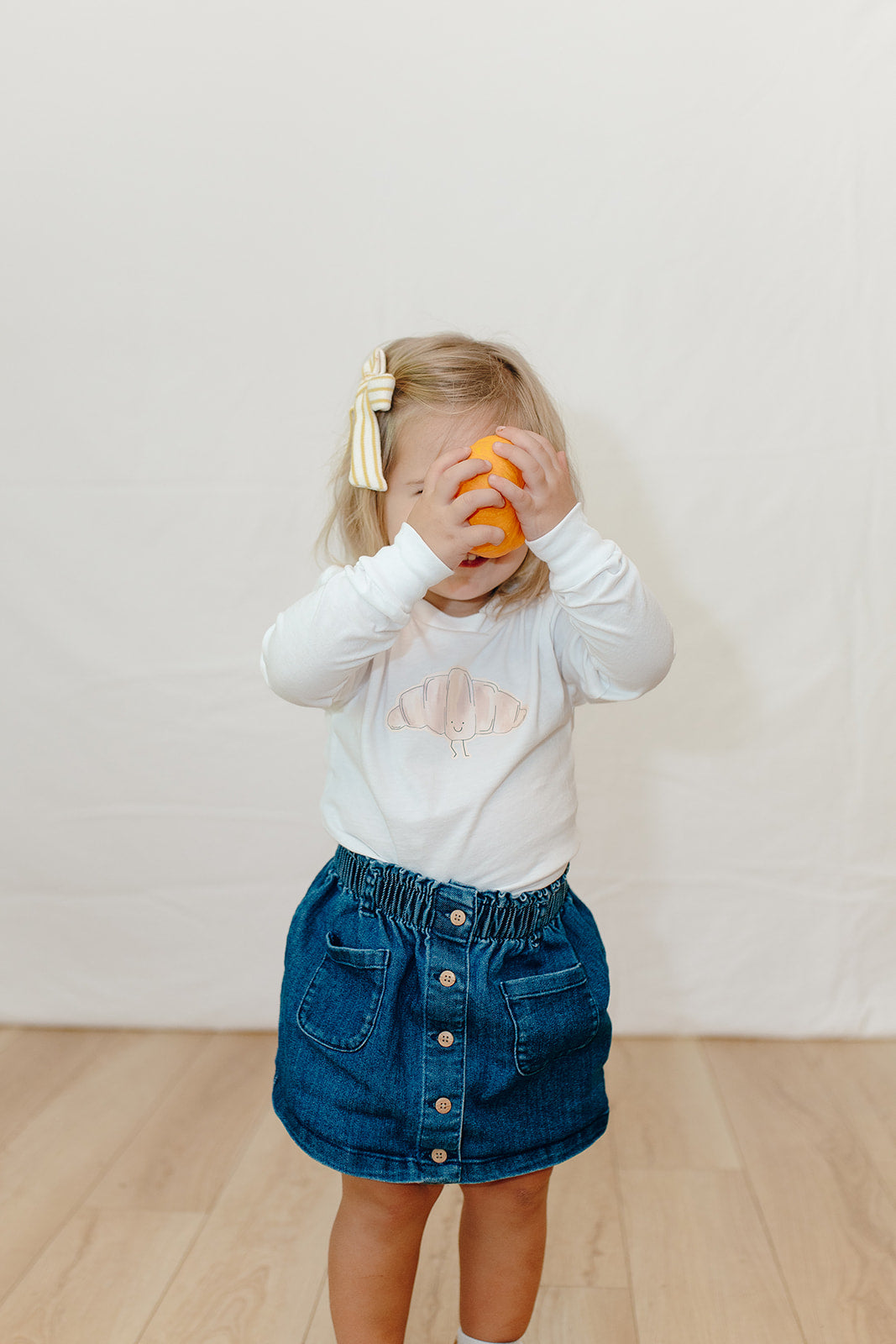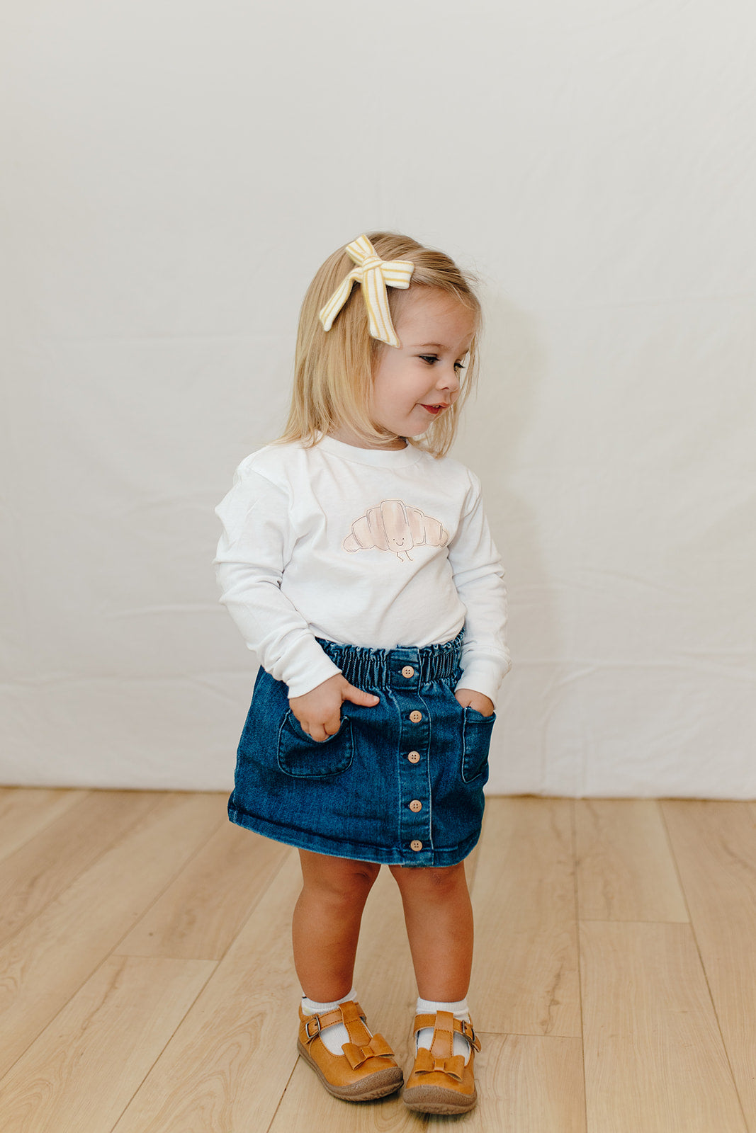 This croissant toddler long sleeve tee is hand drawn by my friend, Jessie Pierce. This Bella + Canva white shirt is perfect for your little girlie all winter long.